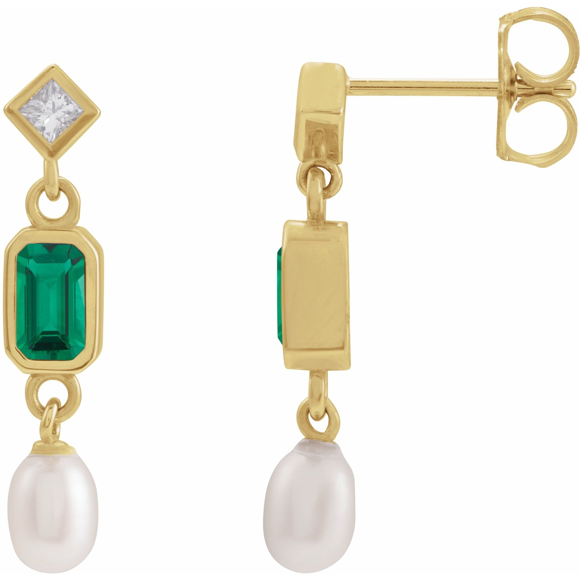 14K Yellow Lab-Grown Emerald, Cultured White Akoya Pearl & .05 CTW Natural Diamond Earrings