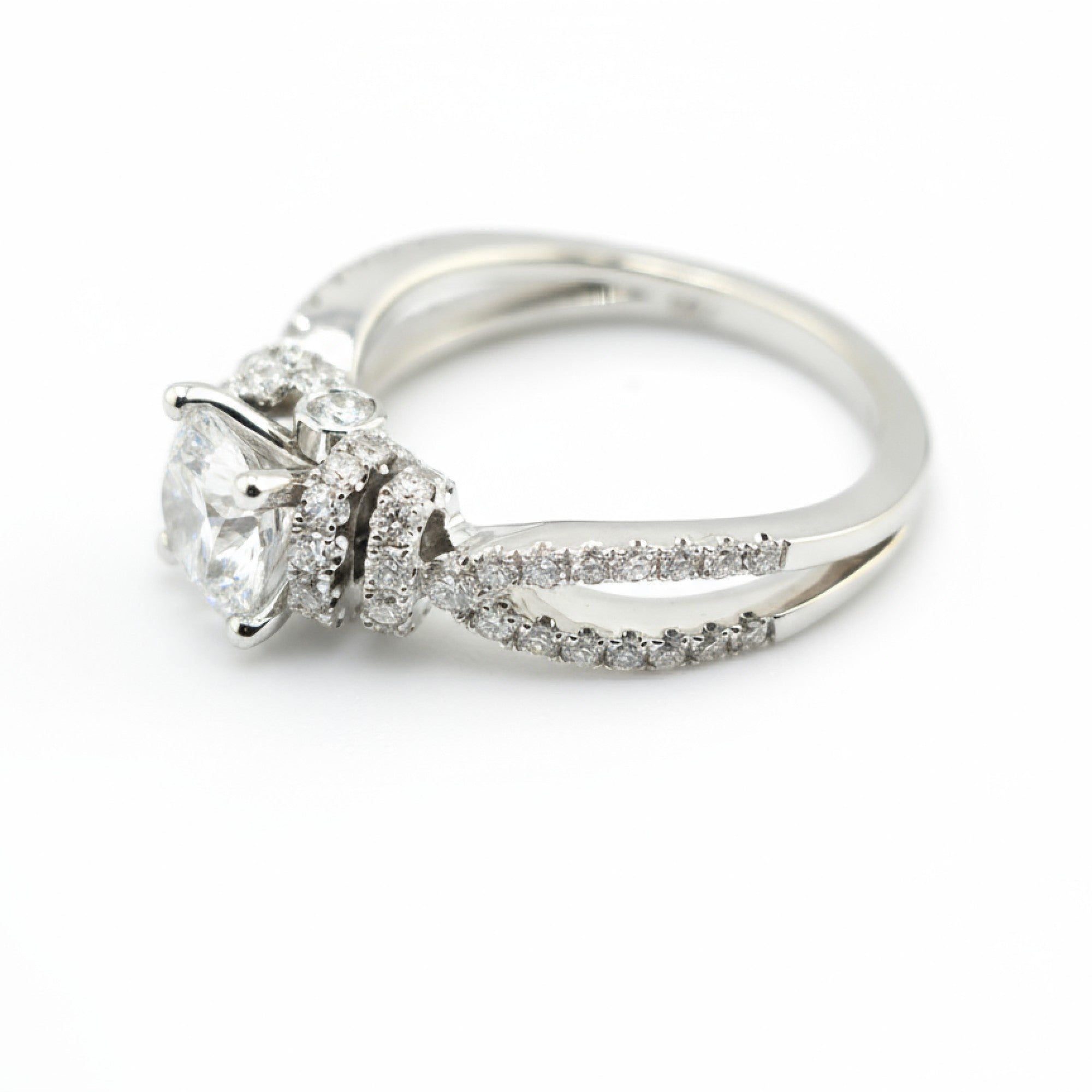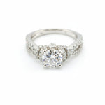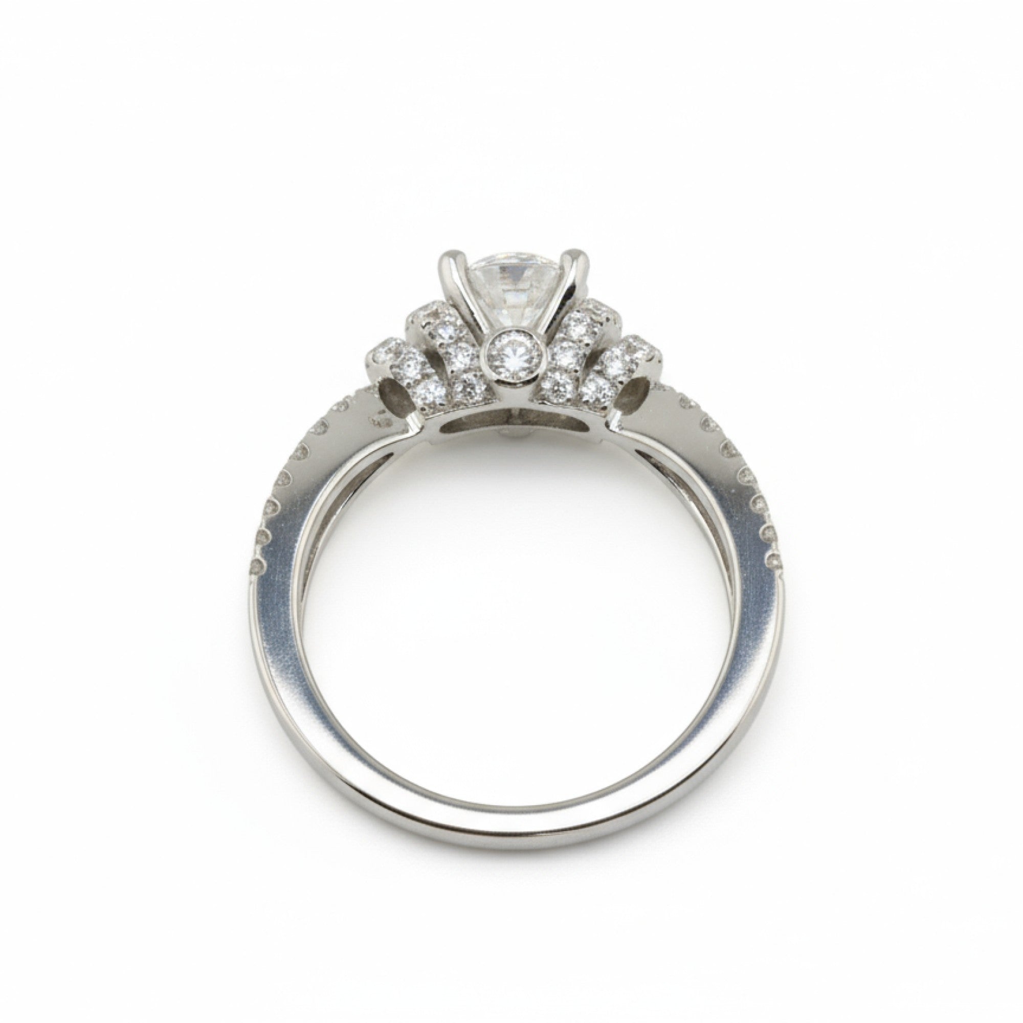 Ethel showcases a 1.03 carat round brilliant center diamond of Ideal cut and Internally Flawless (IF) clarity, surrounded by pavé and bezel-set accent stones for a total diamond weight of 1.74 carats. Crafted in 18k white gold, this intricate split-shank design captures exquisite dimension and light—offering a perfect harmony of brilliance, balance, and timeless elegance.