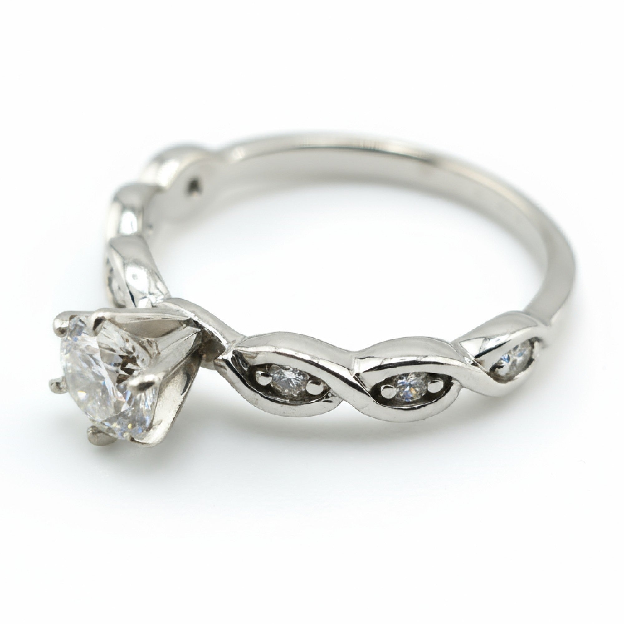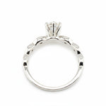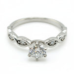 Gladys showcases a 0.54 carat round brilliant center diamond of Ideal cut and Internally Flawless (IF) clarity, accented by bezel-set diamonds along an intricately sculpted band for a total diamond weight of 0.65 carats. Crafted in 14k white gold, this vintage-inspired design intertwines grace and symmetry—creating a piece that feels both romantic and enduring.