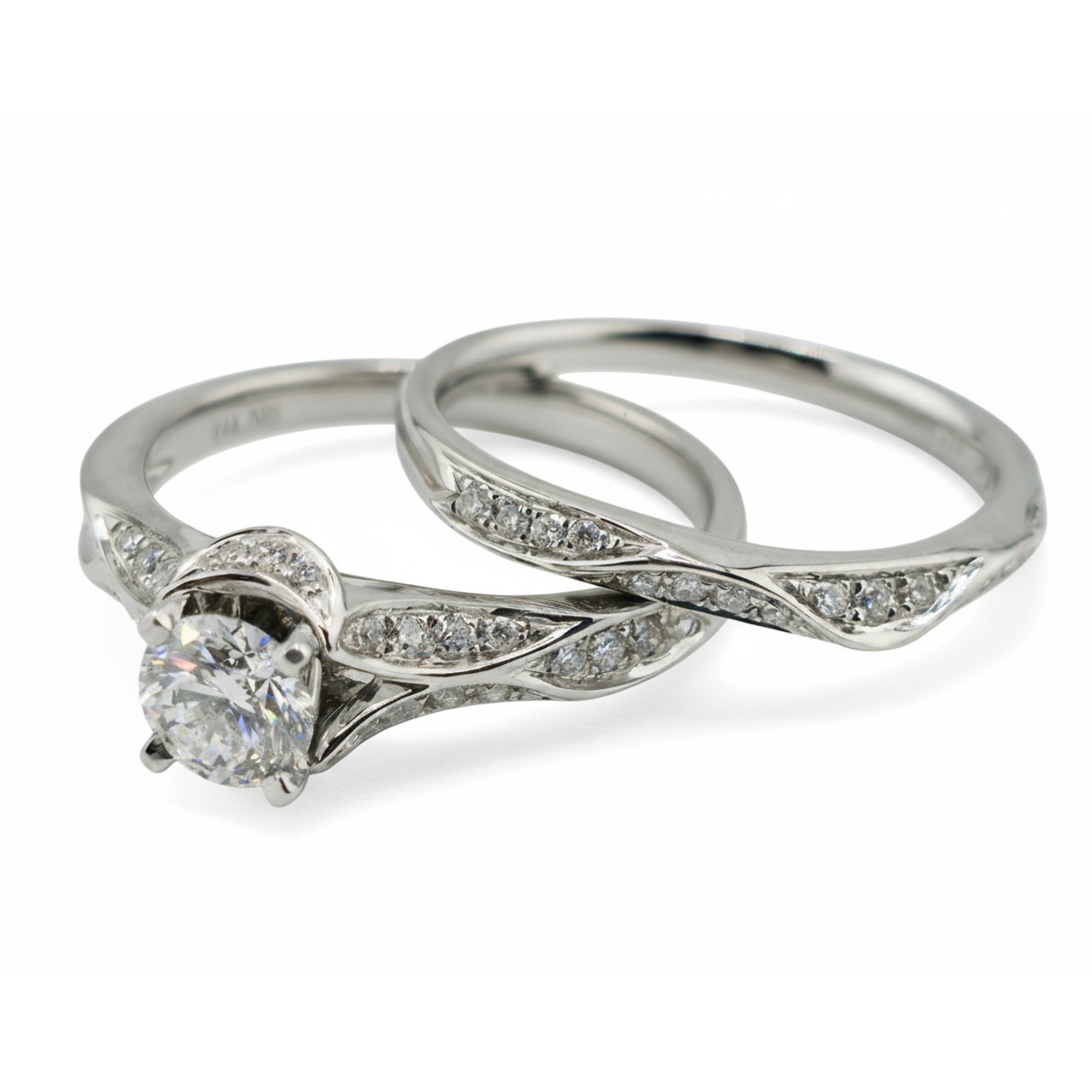 Henrietta showcases a 0.53 carat round brilliant center diamond of Ideal cut and Internally Flawless clarity, with matching diamond accents for a total carat weight of 0.87. The elegant twist motif of both the engagement ring and matching band captures the flow of everlasting connection. Expertly crafted in 14k white gold, this set reflects sophistication, harmony, and light in every angle.
