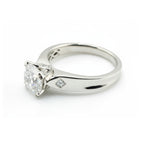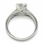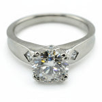 Justine showcases a 1.53 carat round brilliant center diamond of Ideal cut and VVS1 clarity, accented by channel-set princess-cut side stones for a total diamond weight of 1.68 carats. Crafted in 14k white gold, its bold, structured band and clean geometry create a contemporary statement of elegance and enduring strength.