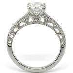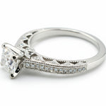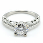 Lucille showcases a 1.04 carat round brilliant center diamond of Ideal cut and Internally Flawless (IF) clarity, surrounded by pavé-set accents for a total diamond weight of 1.19 carats. Designed by Scott Kay and crafted in 14k white gold, this ring blends vintage inspiration with contemporary precision—featuring fine milgrain edges, open filigree detailing, and radiant symmetry from every angle.