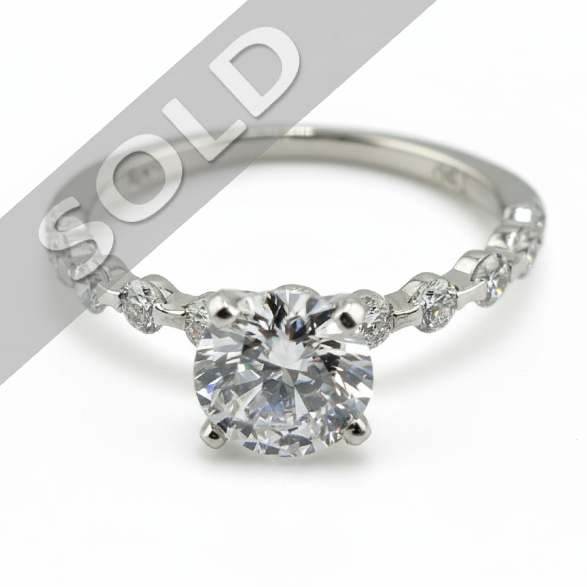Marion showcases a 1.09 carat round brilliant center diamond of Ideal cut and VVS1 clarity, accented by alternating bezel and prong-set diamonds along the band for a total diamond weight of 1.52 carats. Crafted in 18k white gold, this elegant design captures the essence of timeless sophistication—where craftsmanship and brilliance meet in perfect harmony.