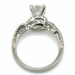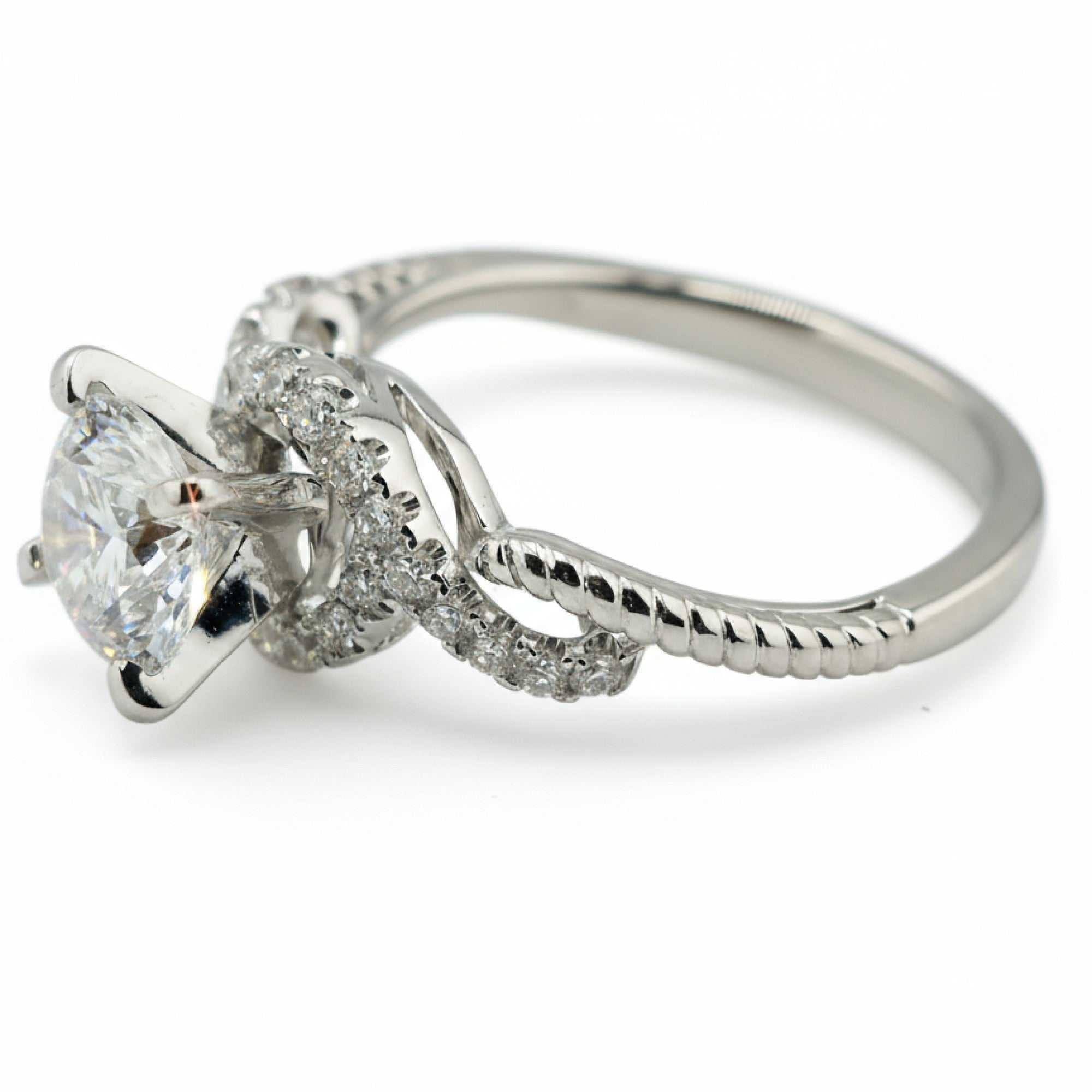 Moxie showcases a 1.09 carat round brilliant center diamond of Ideal cut and VVS1 clarity, accented by pavé-set diamonds along a graceful twist halo and split-shank band for a total diamond weight of 1.35 carats. Crafted in 14k white gold, this artful design embodies contemporary elegance and radiant movement, creating a captivating play of light with every glance.