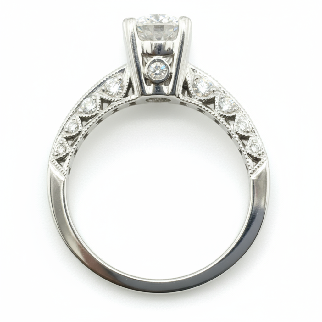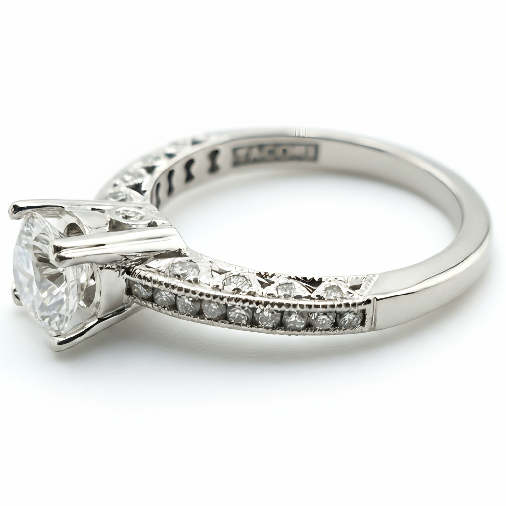 Naudine is a 1.44 CT TW (1.03 CT center stone) carat round diamond with ideal cut, elegantly crafted in 18k white gold. Created by Tacori, masters of handcrafted design and fine artistry, this ring radiates confident elegance.