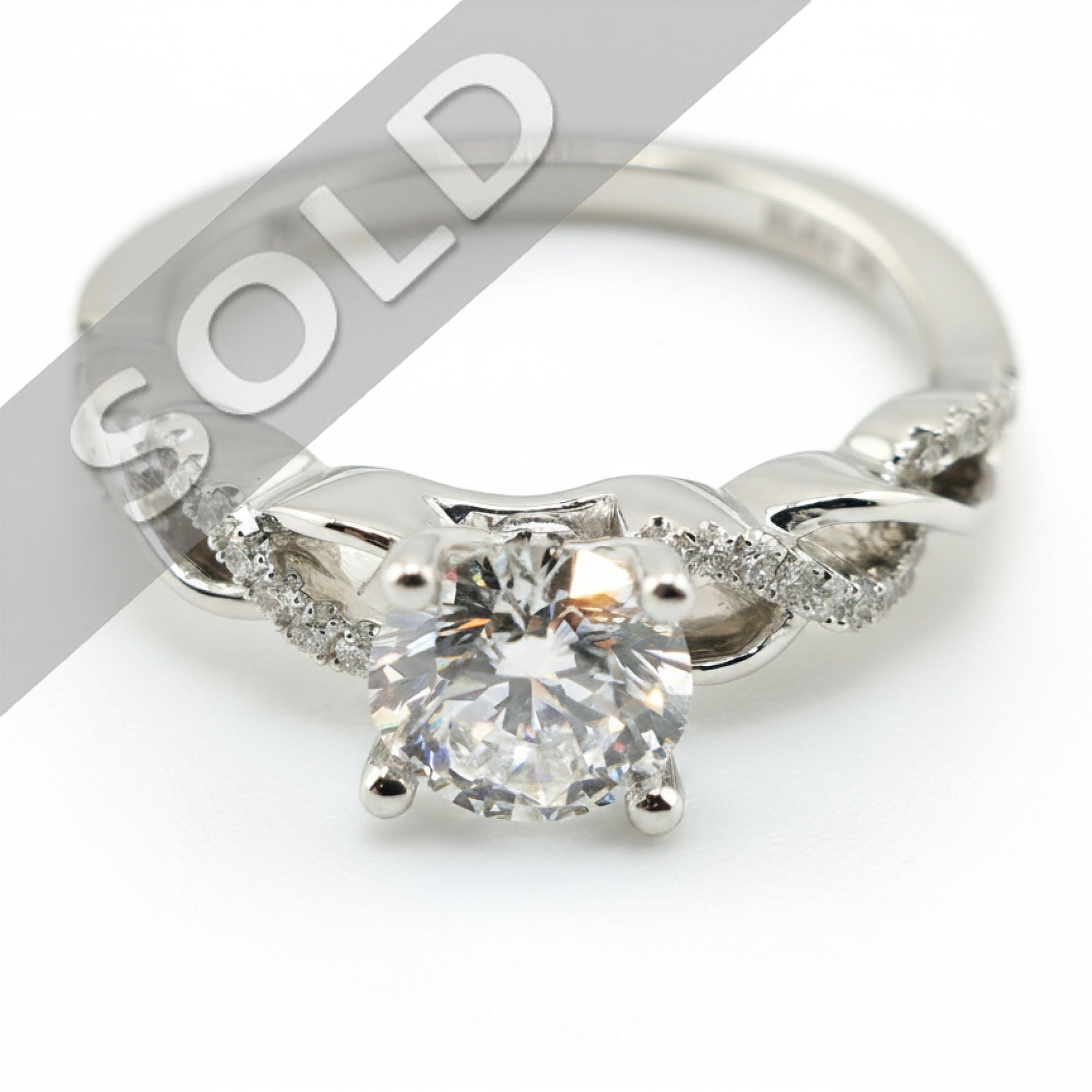 Ramona showcases a 1.07 carat round brilliant center diamond of Ideal cut and VVS1 clarity, accented by pavé-set stones that flow along an elegant twist for a total diamond weight of 1.23 carats. Designed by Elma & Gill and crafted in 18k white gold, this captivating piece combines modern sophistication with timeless artistry—an exquisite balance of motion, light, and grace.