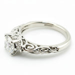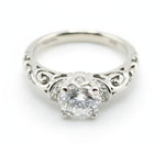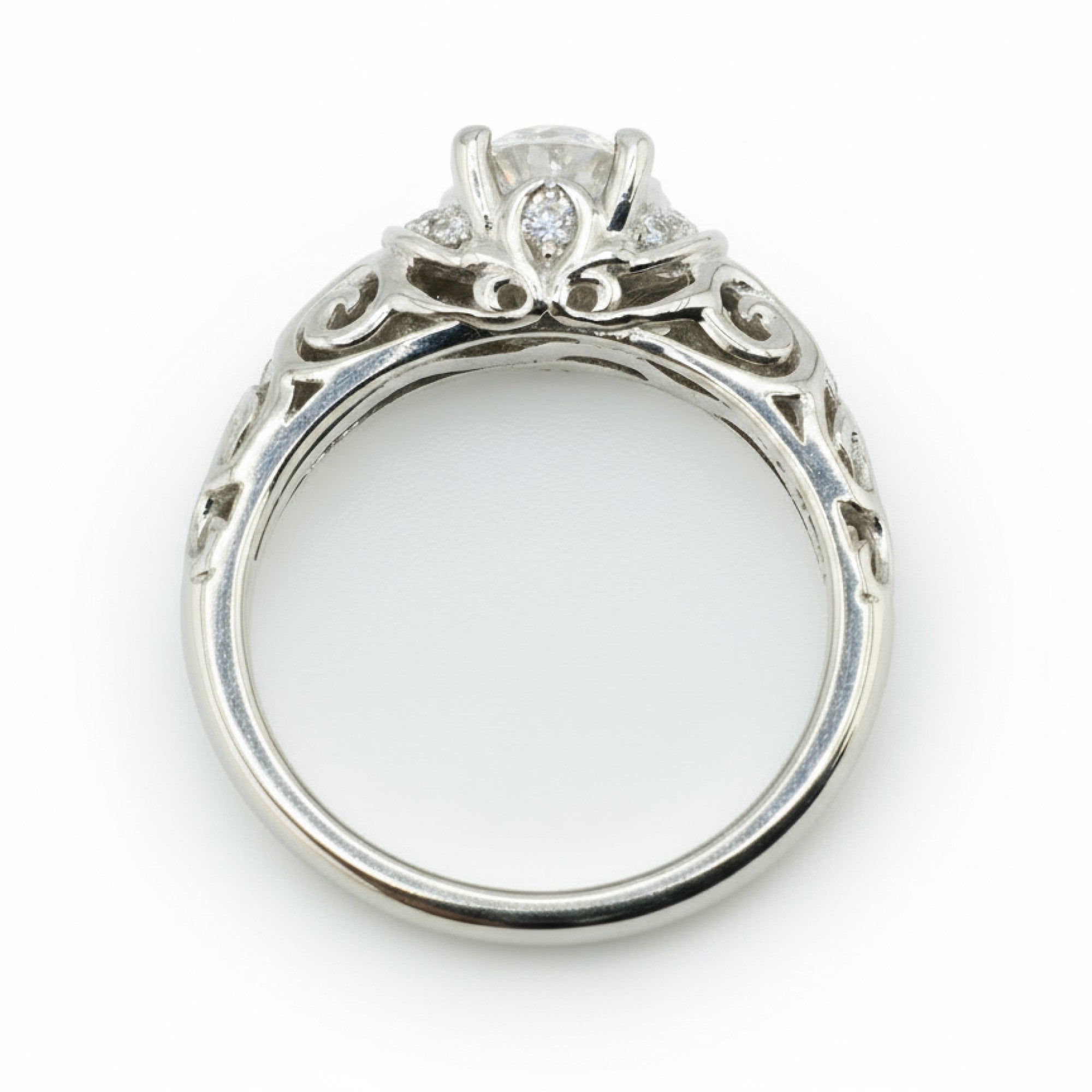 Willow features a 1.03 carat round brilliant center diamond of Ideal cut and Internally Flawless clarity, surrounded by accent stones that bring the total diamond weight to 1.15 carats. Expertly crafted in 14k white gold, the design showcases delicate scroll motifs and bead-set diamonds that dance with light—an ode to vintage elegance and enduring love.