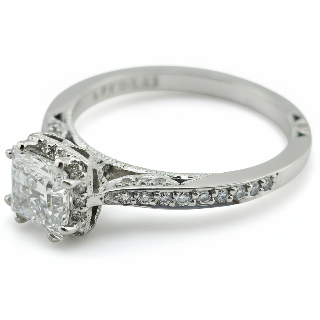 Nina features a 1.27 CT TW (1.02 CT center stone) carat princess-cut diamond with VVS1 clarity, set in 18k white gold. Designed by Tacori, famed for precision geometry and artisanal detail, this ring pairs sharp lines with luminous beauty.