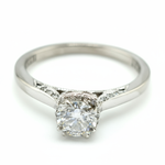 Mia is a .62 CT TW (.52 CT center stone) round diamond with ideal cut, elegantly presented in 18k white gold. Designed by Tacori, recognized for masterful detail and handcrafted beauty, Mia embodies delicate sophistication.