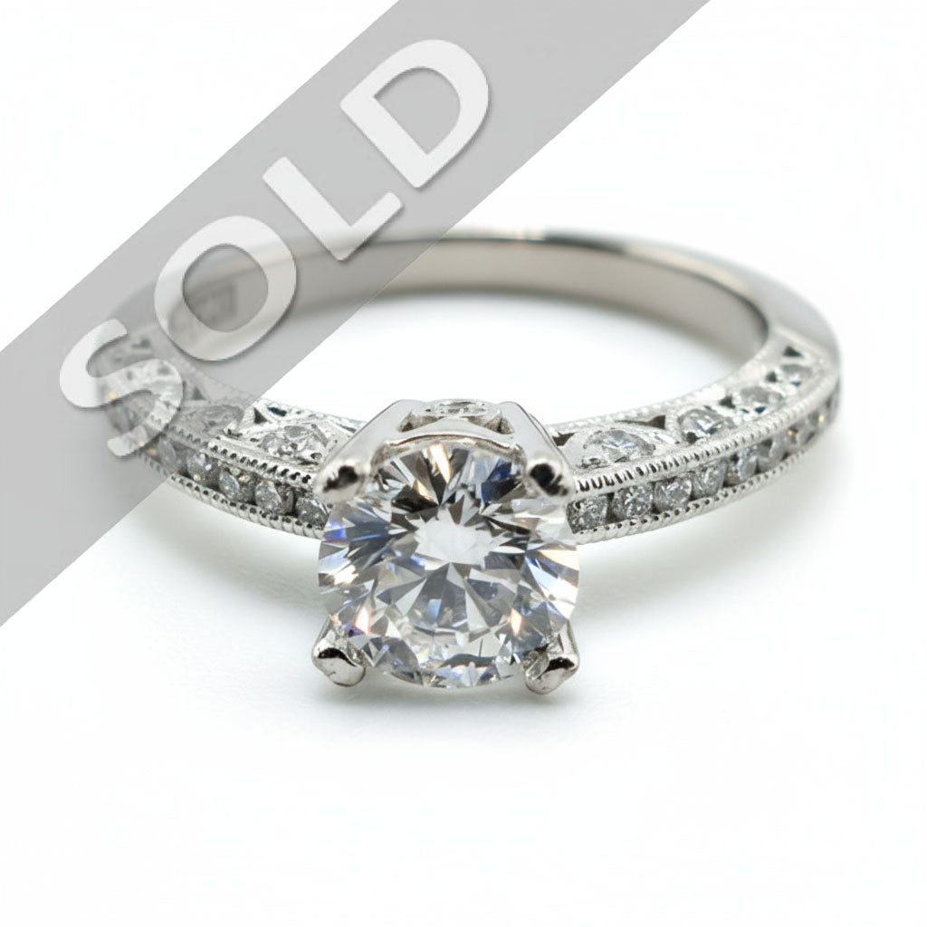 Naudine is a 1.44 CT TW (1.03 CT center stone) carat round diamond with ideal cut, elegantly crafted in 18k white gold. Created by Tacori, masters of handcrafted design and fine artistry, this ring radiates confident elegance.