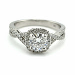 The Ophelia ring features a dazzling 1.07 carat Ideal cut round diamond of D color and VVS1 clarity, set within a delicate halo of accent diamonds. The intertwined pavé band in 14k white gold adds dimension and fluidity, creating a breathtaking display of light and sparkle.