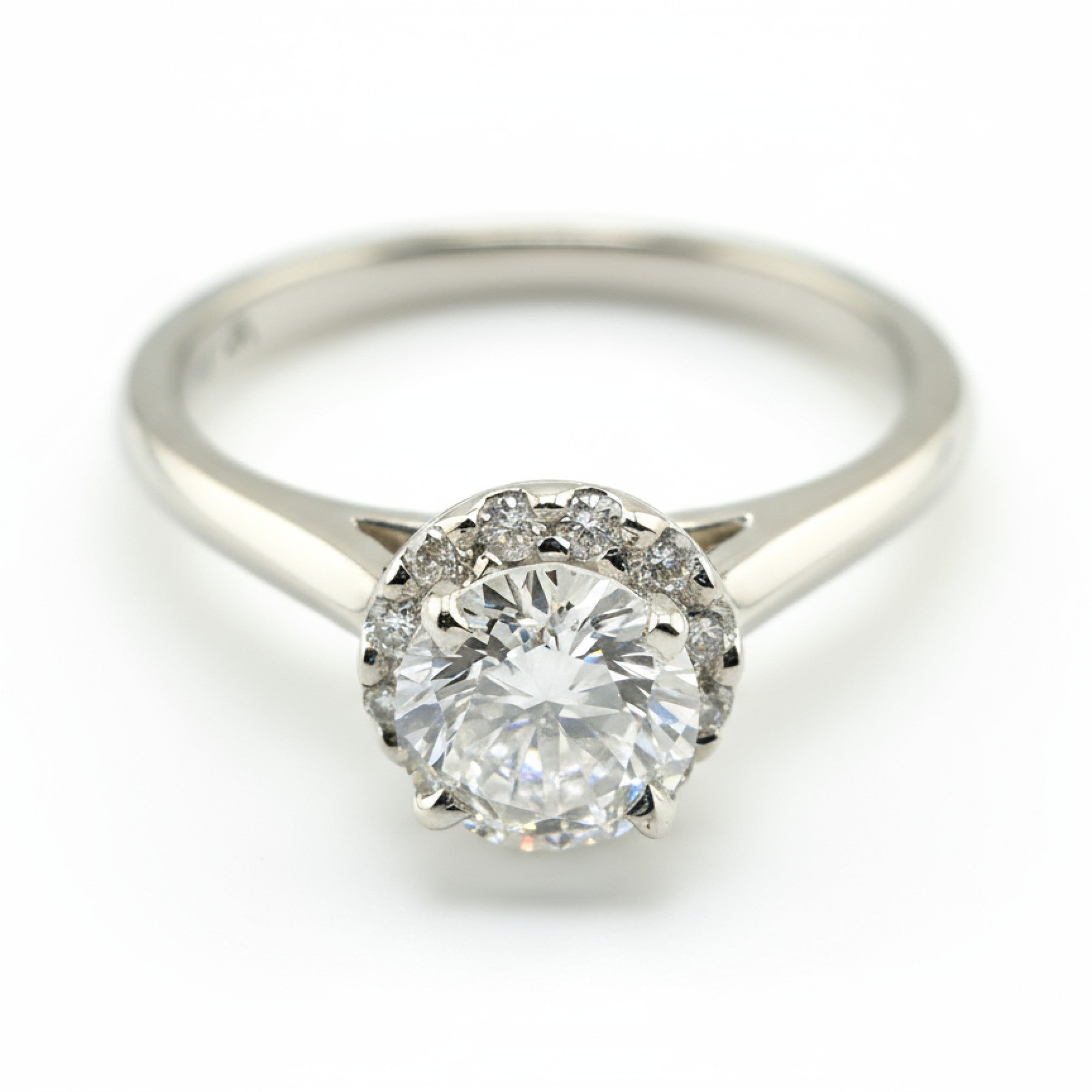 Rosalie showcases a 1.09 carat round brilliant center diamond of Excellent cut and VVS1 clarity, surrounded by a halo of pavé-set accent stones for a total diamond weight of 1.28 carats. Crafted in 14k white gold, this classic yet contemporary design radiates sophistication and warmth—perfect for those drawn to understated elegance and lasting beauty.