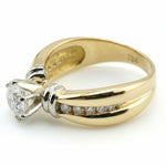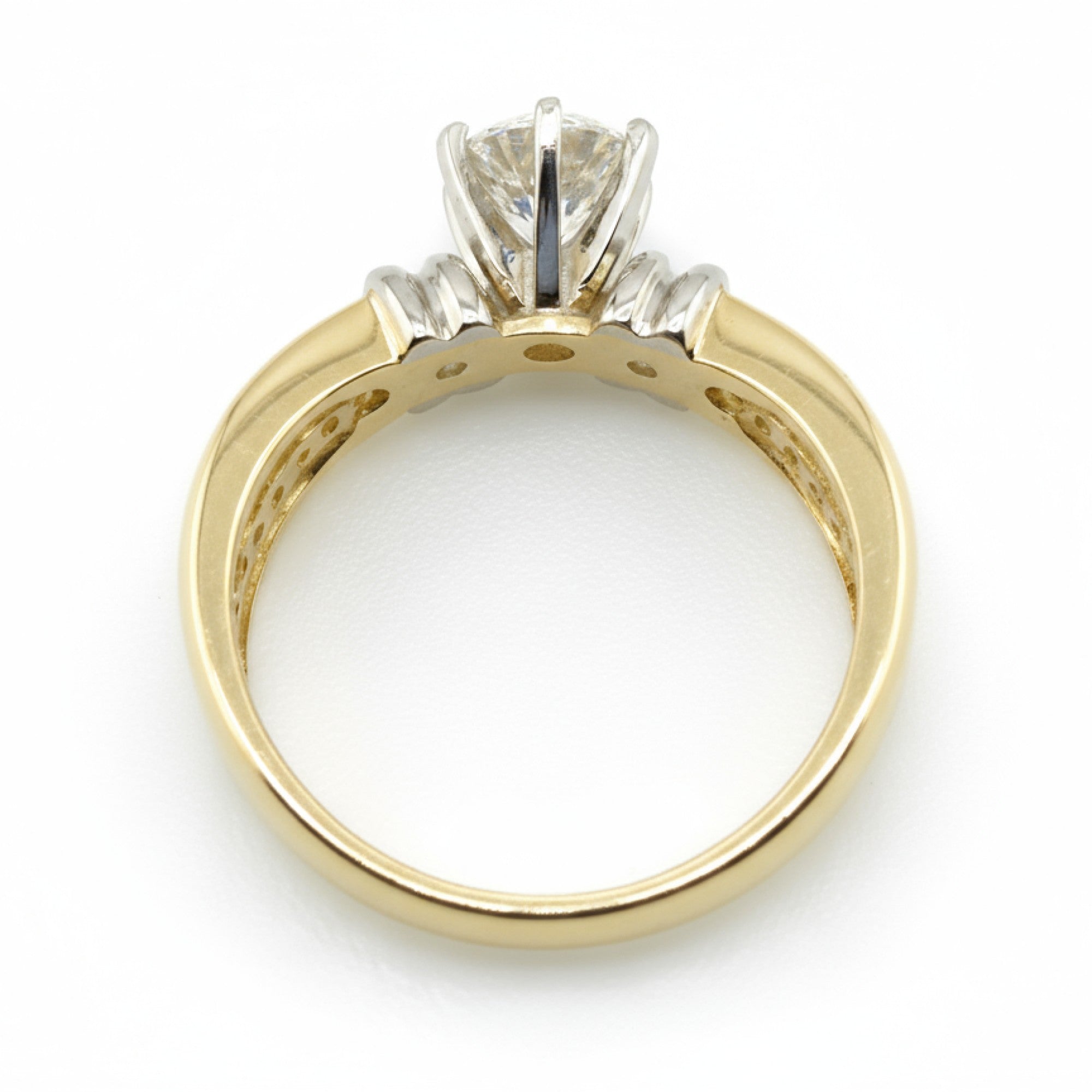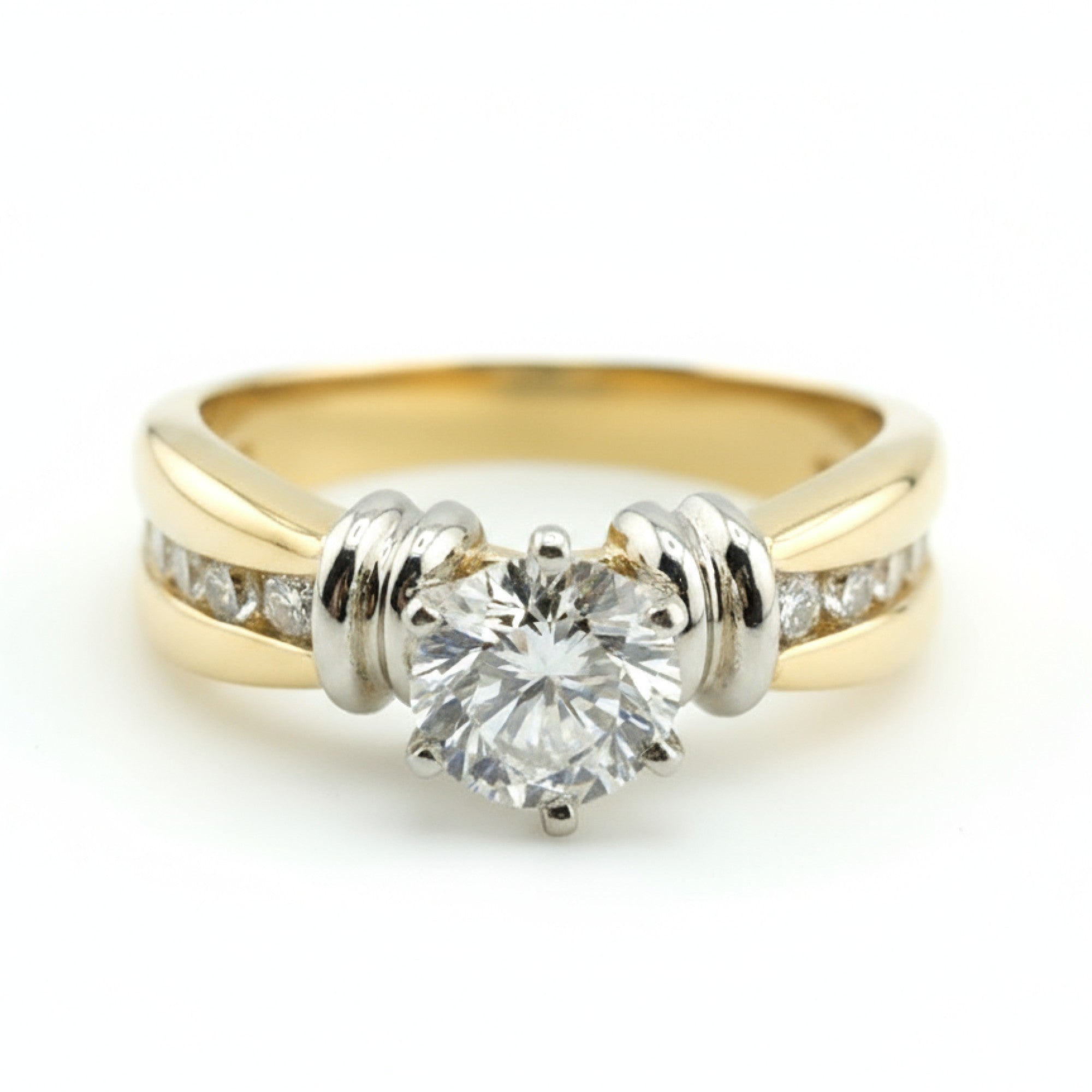 Ruth features a 0.76 carat round brilliant center diamond of Ideal cut and VVS1 clarity, complemented by channel-set accent diamonds along a yellow gold band for a total diamond weight that shimmers with refined brilliance. The white gold setting enhances the diamond’s fire, creating a sophisticated two-tone design that blends classic luxury with modern strength.