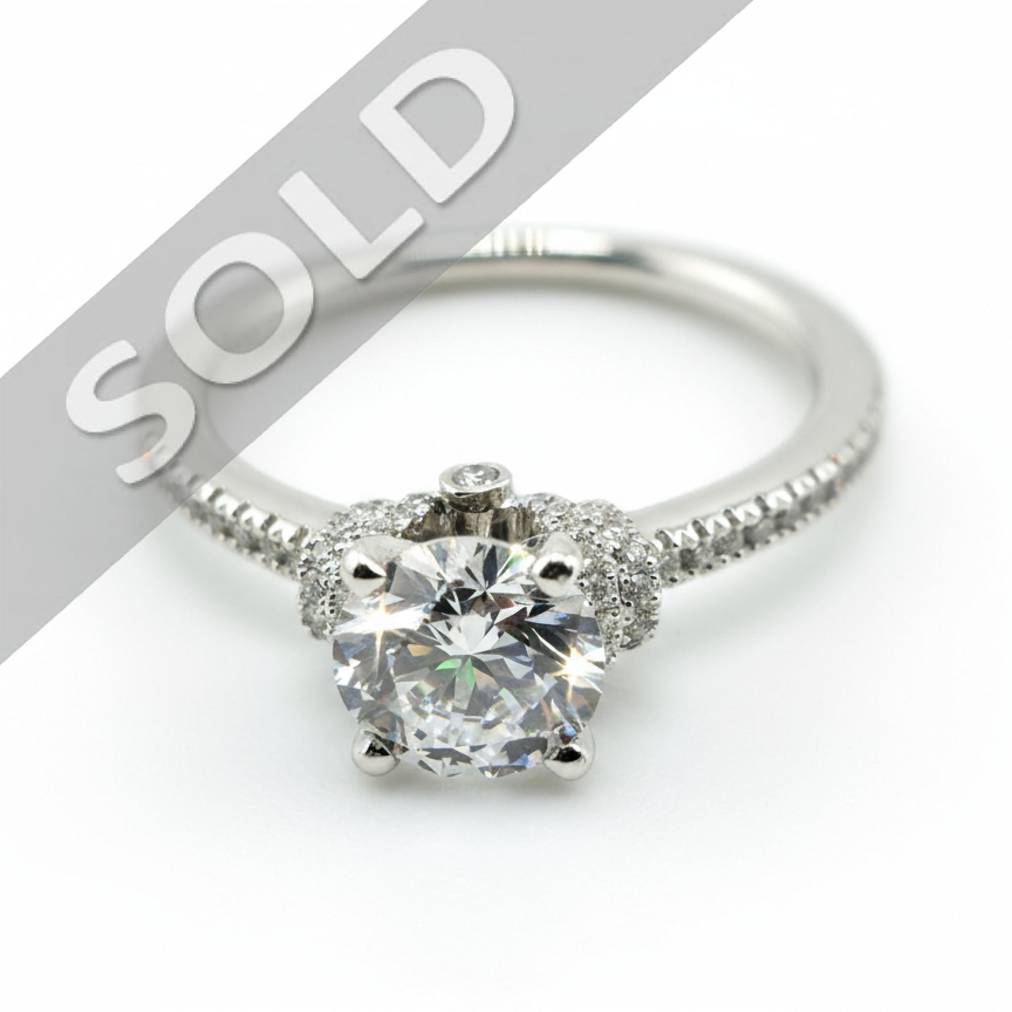 Valerie features a 1.07 carat round brilliant center diamond of Ideal cut and VVS1 clarity, surrounded by a delicate pavé halo and accented band for a total diamond weight of 1.31 carats. Crafted in 14k white gold, its elegant profile and subtle bezel detailing capture light with exquisite grace—perfect for those who value sophistication with a modern touch.