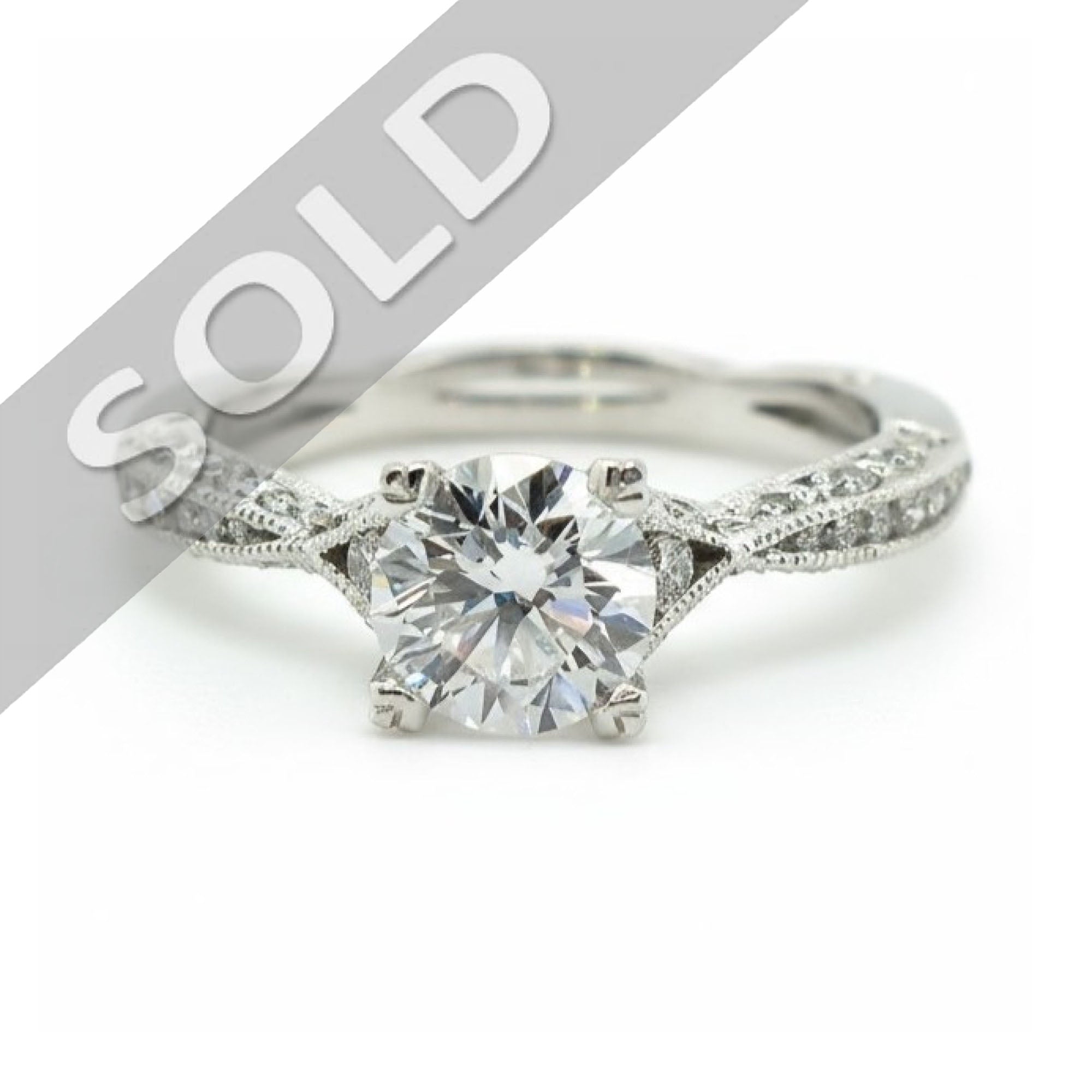 Bonnie is a 1.32 CT TW (1.04 CT center stone) round diamond with ideal cut and VVS1 clarity, beautifully presented in 18k white gold. Designed by Tacori, celebrated for their handcrafted designs and remarkable attention to detail, this piece captures the essence of refined luxury.