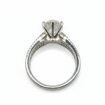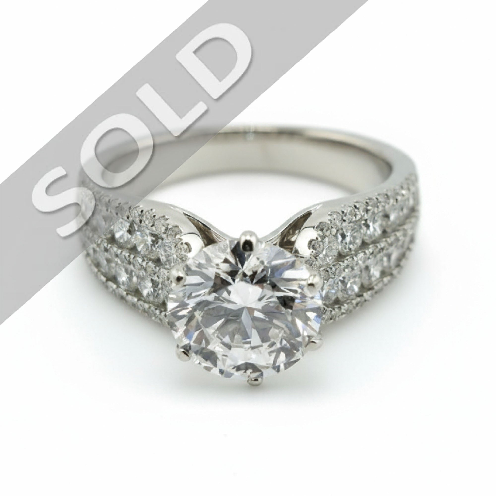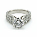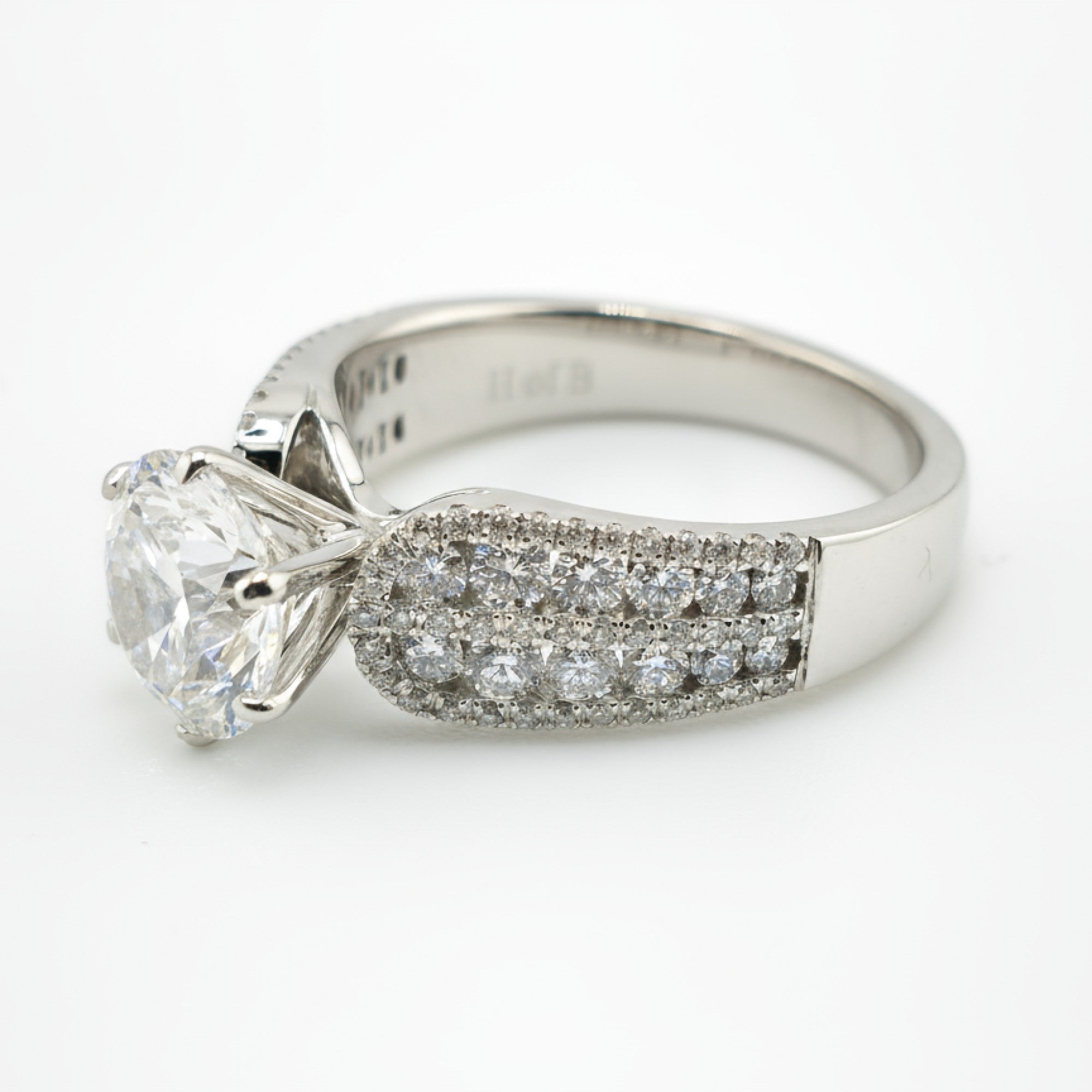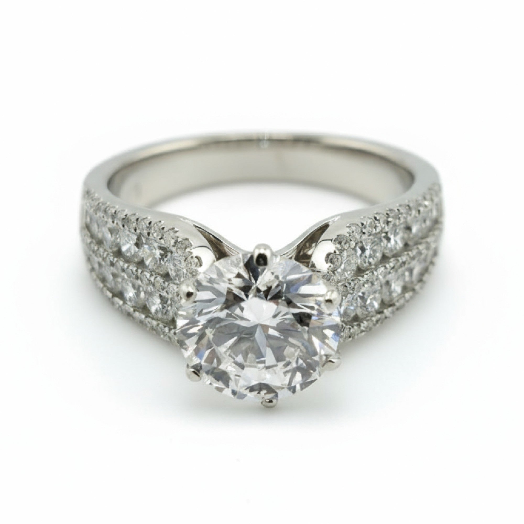 Bridget showcases a 2.02 carat round brilliant center diamond of Ideal cut and VVS1 clarity, framed by three rows of pavé-set accent stones for a total diamond weight of 2.87 carats. Crafted in 14k white gold, its bold yet elegant design enhances the diamond’s fire and symmetry—offering a captivating blend of strength and sophistication.
