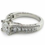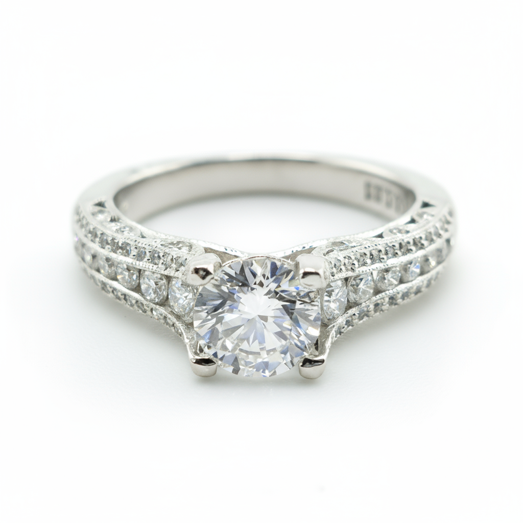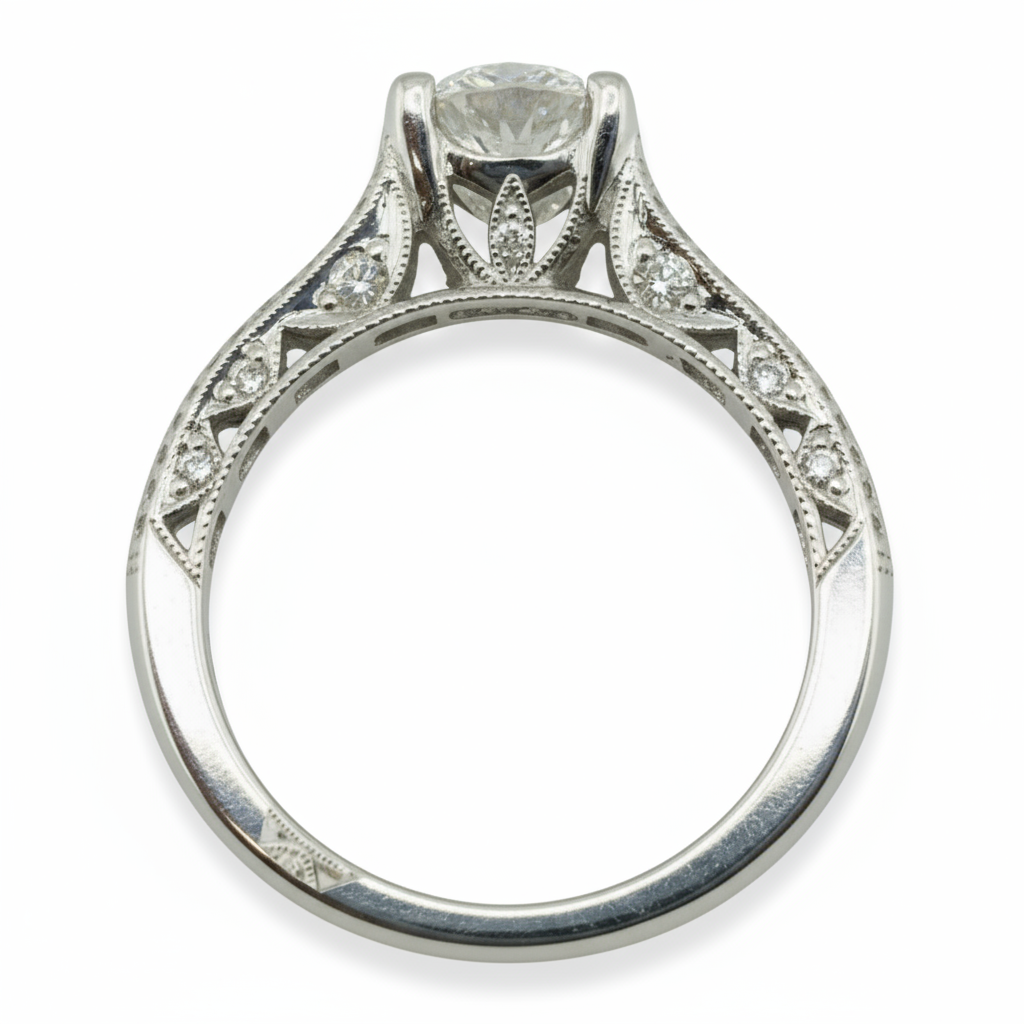 Charlotte features a 1.65 CT TW (1.04 CT center stone) round diamond of ideal cut and VVS1 clarity, set in 18k white gold. Designed by Tacori, known for their stunning handcrafted artistry and impeccable attention to detail, this ring radiates sophistication from every angle.