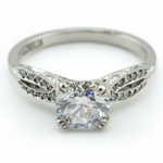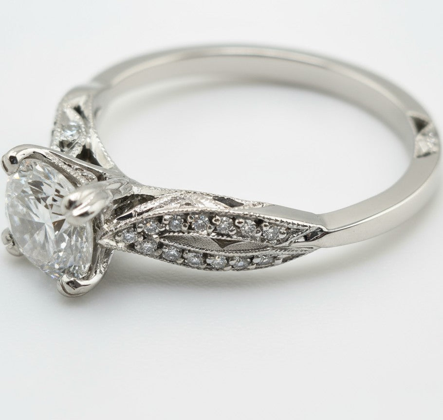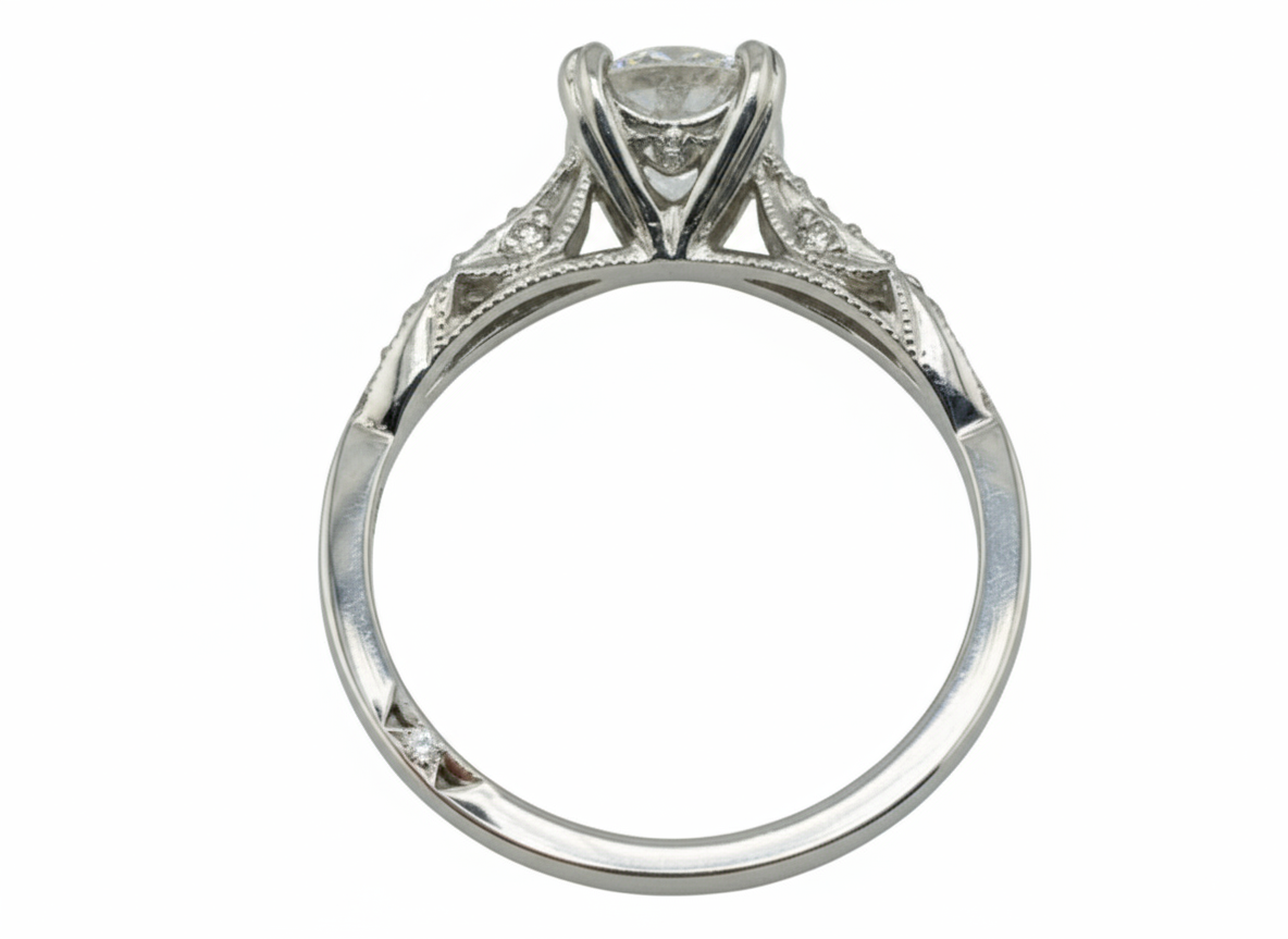 Cora is a 1.16 CT TW (1.02ct center stone) round diamond with ideal cut and VVS1 clarity, refined within 18k white gold. Designed by Tacori, artisans of exceptional craftsmanship and timeless design, Cora shines with understated brilliance.